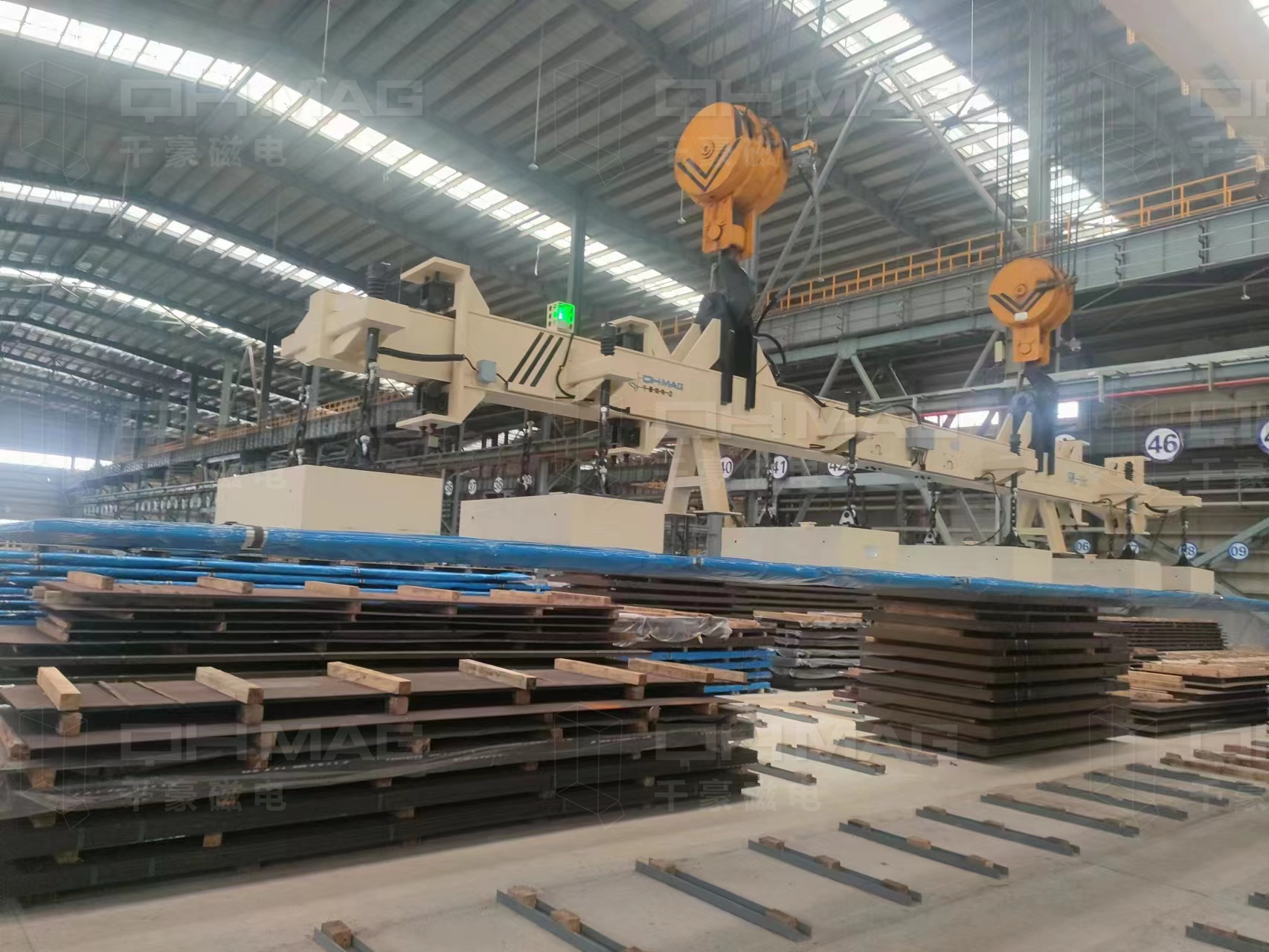 本次案例來源于:湖南千豪磁電為廣西某有限公司設(shè)計(jì)的【伸縮梁電永磁吊具】,由于該公司鋼板堆放空間有限鋼板長度尺寸差距較大,原有設(shè)備跺板機(jī)在吊運(yùn)中經(jīng)常劃傷包裝,設(shè)備因汽車尺寸限制而產(chǎn)生干涉,嚴(yán)重影響鋼板出庫的質(zhì)量和效率,因此千豪磁電依據(jù)該公司鋼板尺寸設(shè)計(jì)了這款伸縮橫梁電永磁吊具。