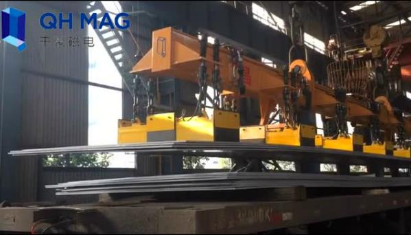 中厚板多張起吊可以采用電永磁吊具,湖南千豪可根據(jù)客戶需求定制解決方案,其產(chǎn)品設(shè)計(jì)具有調(diào)磁功能,吸料時(shí)調(diào)節(jié)電壓即可滿足單張多張切換起吊。吸吊鋼板時(shí),采用調(diào)磁保磁控制設(shè)備;在起重電磁鐵所吊物料運(yùn)行至指定位置過程中,如遇電網(wǎng)停電或主整流部分故障;或人為關(guān)掉電源,備用電源立即自動(dòng)投入,以保證被吸物料不致落下;以防砸壞設(shè)備、傷及人員等發(fā)生安全事故。